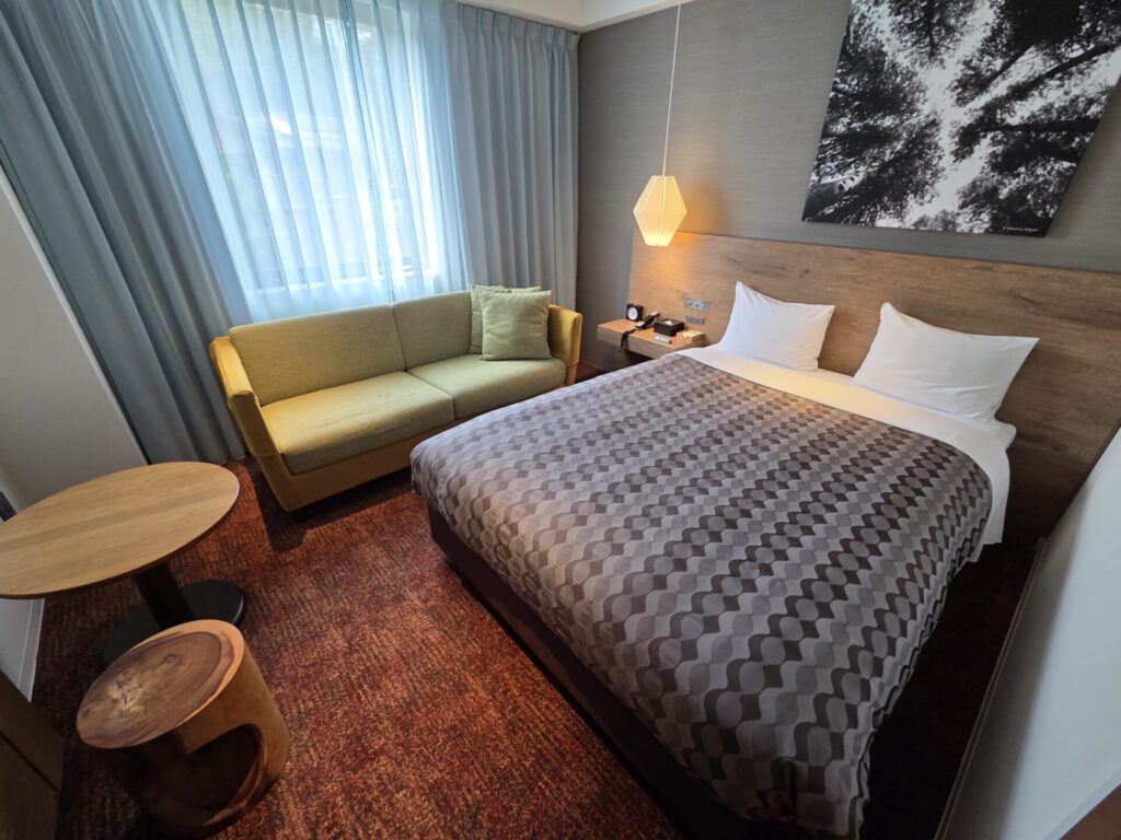 今回は1人でスタンダードダブルルームに宿泊しました。部屋を全体的に見るとこんな感じ。コンパクトな部屋ですが、広々としたソファがあるのは良いですね。