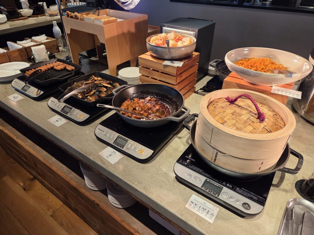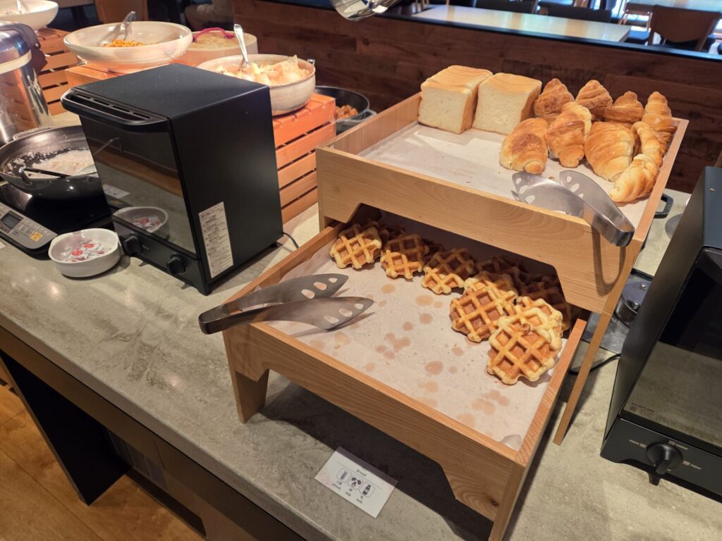 食事のラインナップは結構ラインナップが広くてかなり迷いました。全部は撮りきれなかったのでいくつかピックアップしていきます。定番の食パンやクロワッサンに加えて、ワッフルがあるのが嬉しい。