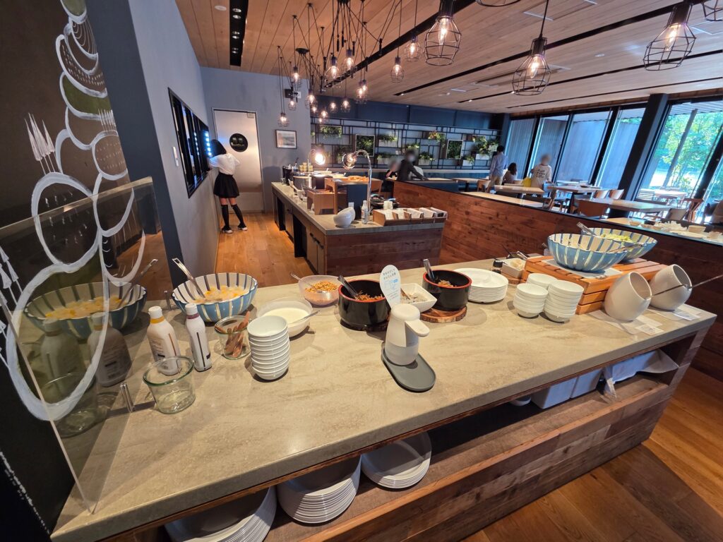 高千穂はそこまで朝からやっている店も多くないので、ホテルで朝食を取ることに。朝食はビュッフェ形式で、時間は7:00~9:30となっています。レストランも木が多く使われ、窓も大きくてオシャレな空間です。
